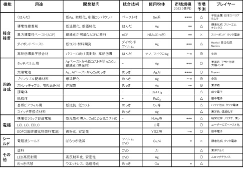 機能性ペーストは、数千億円の市場規模があり、数十社の参入がある。既存の太陽電池やタッチパネル用途だけでなく、次世代自動車や再生可能エネルギーなど今後の省エネ社会のキーテクノロジーとなるパワー半導体やウエアラブルデバイスにおけるプリンテッドエレクトロニクスなど、立ち上がりが期待される新しい市場においても欠かせない材料となる。